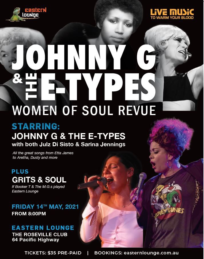 The Southern Soul Revue featuring “Soul Sista #1” Julz Di Sisto and “The Soul Man” Glen Whitehall performing soul classics including “Knock On Wood”, “RESPECT”, “Hold On I’m Coming” “In The Midnight Hour”, ‘Son Of A Preacher Man, Hard To Handle” and mo’. Book your tickets at Camelot Lounge in Marrickville. Tickets https://www.stickytickets.com.au/17387/johnny_g__the_etypes_southern_soul_revue.aspx